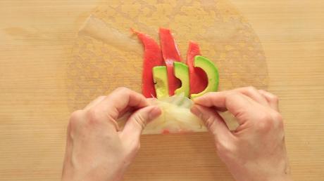 (3)と同様にして湿らせたライスペーパーの中央に、スモークサーモンとアボカドの1/2量を縦に交互に並べ、(1)の1/4量をやや手前にのせます。