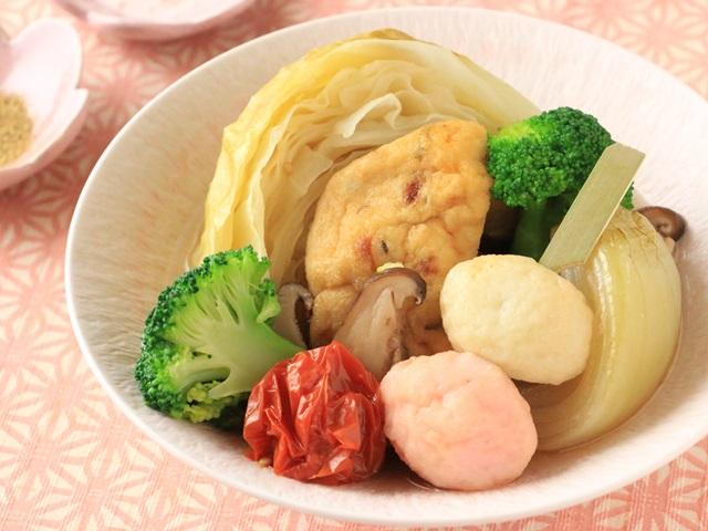 ザ・ココットに昆布、干しシイタケ、(a)を入れます。①、ミディトマト、半分に切ったがんもどき、練り天団子を入れ、蓋をしてグリルで調理します。