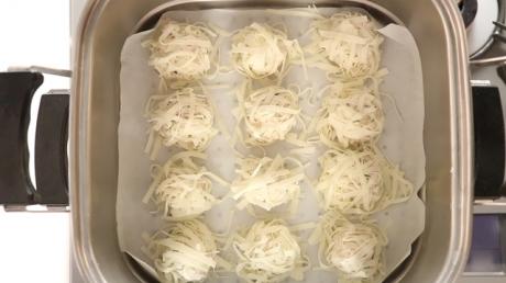 焼売の皮は3mm幅に切ってバットに入れ、片栗粉をまぶしてほぐします。