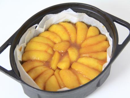 クッキングシートを敷いたダッチオーブンに(2)を敷き詰めます。
