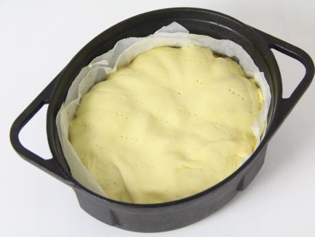 パイシートはダッチオーブンよりひとまわり大きく伸ばしてピケをします。(3)の上にかぶせ、周囲の生地は押し込みます。