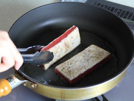 フライパンにゴマ油をなじませ、≪温度キープ200℃≫に設定します。設定温度になれば、塩、コショウをしたマグロの表面をサッと焼き、取り出します。