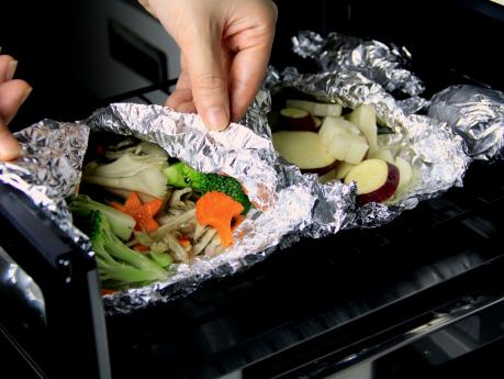 (5)に塩、コショウ、オリーブ油をからめ、アルミ箔に包み≪グリル≫で焼きます。