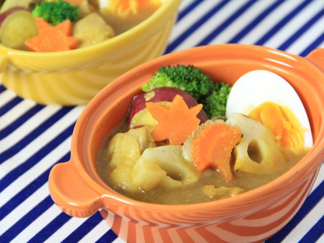 サツマイモ、レンコン、ニンジンは7~8mm厚さに切り、レンコンはいちょう切りにし、ニンジンは型で抜きます。マイタケ、ブロッコリーは小房に分けます。