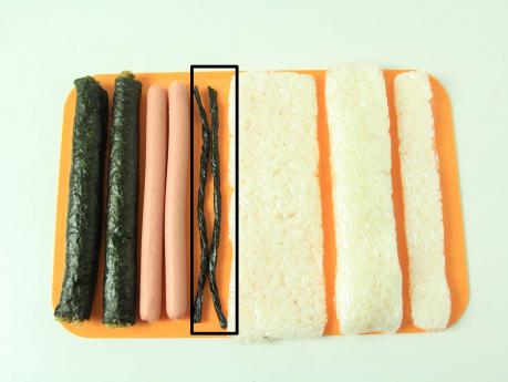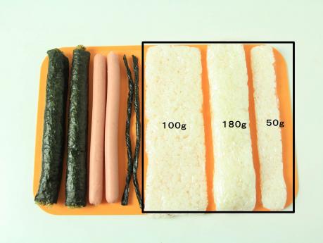 (7)のすしめしの両端にポールウインナーを1本ずつ置き、180gの(6)をのせて間を埋めるように形を整えます。