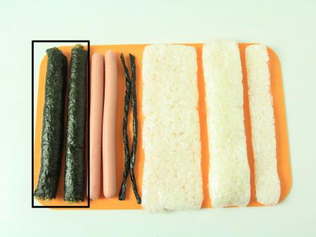 6cmの幅の(3)にのりの佃煮を塗り広げ、細くなるように2本巻きます。(まゆ)