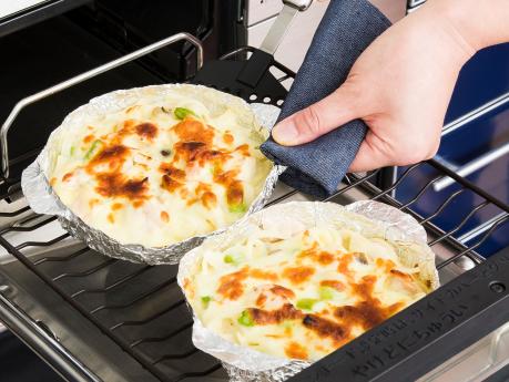 4を分け入れ、ピザ用チーズをのせます。黒コショウをふり、水なし両面焼グリルで焼きます。