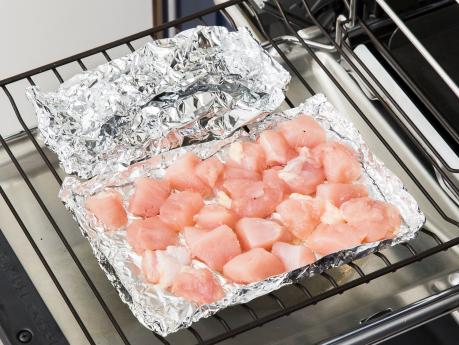 鶏むね肉は2cm角に切り、塩、コショウ、酒をからめてシワを寄せたアルミ箔に並べます。