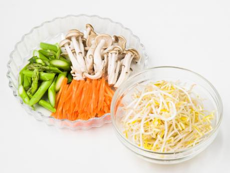シメジは小房に分け、ニンジンはせん切り、グリーンアスパラガスは乱切りにします。