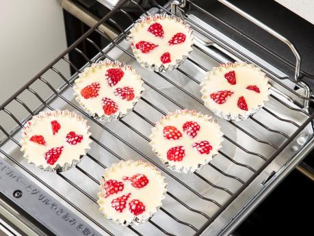 アルミマドレーヌケースに1を分け入れ、2を流し、水なし両面焼グリルで焼きます。