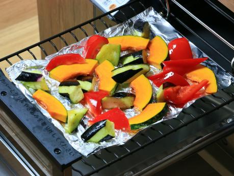 縞目に皮をむいたナスとパプリカは長めの乱切りに、カボチャは種を除いて1cm厚さに切り、塩、コショウ、 オリーブ油をからめます。シワを寄せたアルミ箔にのせ、水なし両面焼グリルで焼きます。