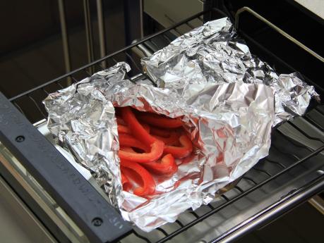 パプリカ、レタスは1cm幅に切ります。パプリカ、モヤシはそれぞれ塩、黒コショウ、ゴマ油をからめてアルミ箔で包み、グリルで焼きます。(両面焼 上下強火 約6分)
