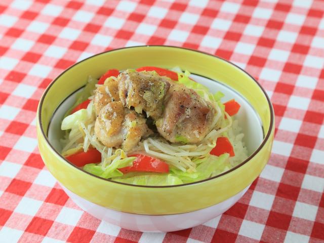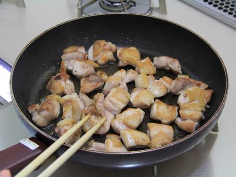 鶏肉はひと口大に切り、塩、黒コショウをします。フライパンにゴマ油を熱し、皮目からキツネ色になるまで焼き、裏返して両面を焼きます。(a)をからめます。