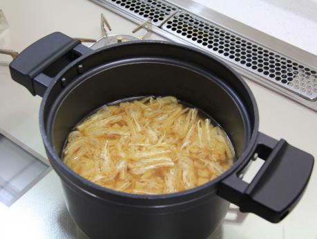 タケノコは5mm角に切り、(a)で煮て冷まし、具と煮汁に分けます。油揚げは油抜きをしてせん切りにします。