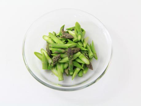 グリーンアスパラガスは根元の硬いところとハカマを取り、乱切りにします。