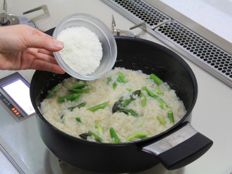 温めたブイヨンを少しずつ加えながら、アルデンテに煮込みます。(中火 約15分)
