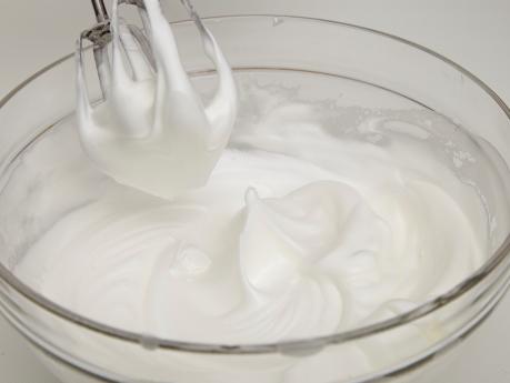 卵(L3個)は卵白と卵黄に分け、卵白を大きめのボウルに入れて泡立てます。ふるった砂糖(90g)を2~3回に分けて加え、そのつど泡立てて、しっかりとしたメレンゲを作ります。