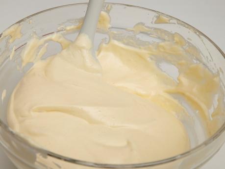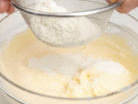 (1)のメレンゲに卵黄、バニラオイル(少々)を加えて軽く混ぜます。薄力粉(75g)をふるい入れ、さっくりと混ぜます。