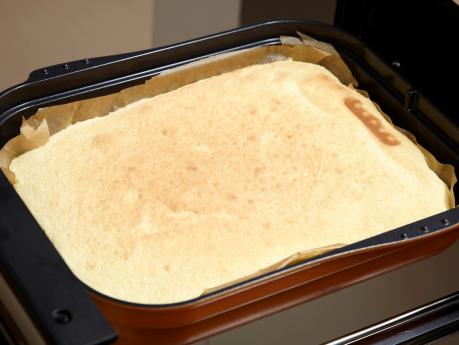 クッキングシートを敷いたキャセロールに、(3)の生地を流し入れて表面を平らにします。マルチグリルを≪調理モード:パン≫に設定し、約12分焼きます。