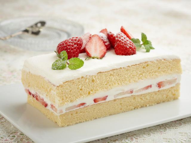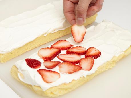 2枚の生地の表面に(6)のクリームを1/3量ずつ塗り、1枚にはお好みの大きさに切ったいちご(10粒程度)(※飾り用に一部とっておきます)をのせます。もう1枚の生地をクリームがついている面を下にしてのせます。最後に残りの1/3量のクリームを表面に塗り、側面を切り揃えます。飾り用のいちご、ミント(適量)をのせ、粉砂糖をふって仕上げます。
