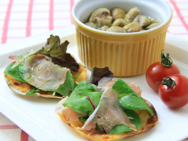 黒コショウをふりベビーリーフ、生ハムをのせプチトマトと共に器に盛ります。