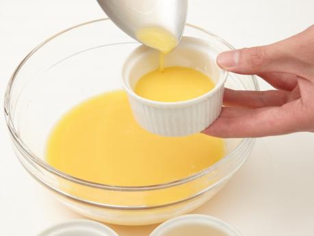 ボウルに卵(L2個)を入れてほぐし、(A)のだし汁(250ml)、塩(小さじ1/3)、薄口しょうゆ(小さじ1)を加えて漉し、ココットに分け入れます。