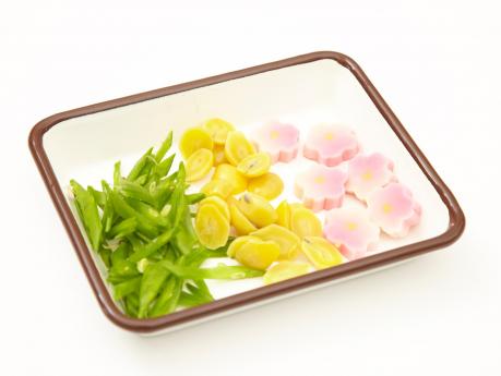 ぎんなん(12個)は鬼殻をむいて、色よくゆで、薄皮を取り半分に切ります。絹さや(9枚)は筋を取り、斜めせん切りにします。