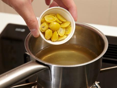 (B)のだし汁(200ml)、みりん・薄口しょうゆ(各小さじ2/3)、塩(少々)を鍋に入れて火にかけます。(4)のゆり根を入れてやわらかくなるまで煮、(3)のぎんなん、絹さや、生麩(6枚)を加えます。