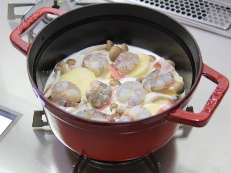 米は洗ってザルにあげ、炊飯用の鍋に入れて(a)を加えます。バター、ふるった薄力粉、チキンブイヨンを加え、(3)、(2)、水気を切った(1)をのせ、炊きます。