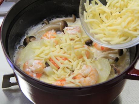 タイマーが終われば蓋を開けてピザ用チーズをちらします。蓋をして約10分蒸らします。