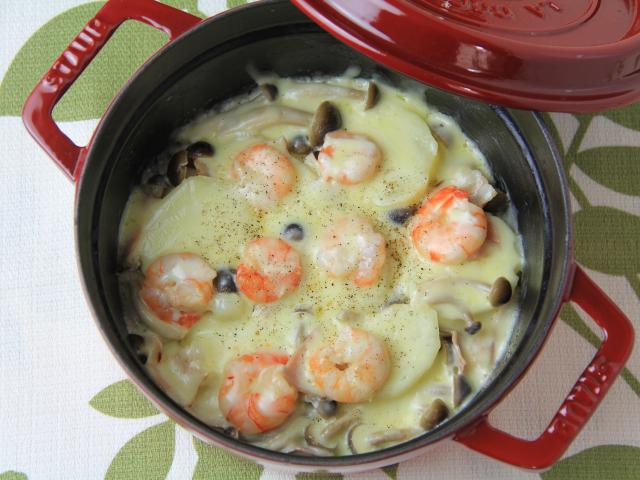 ジャガイモは皮をむき、7~8mm厚さの輪切りまたは半月切りにします。シメジは石づきをとり、小房に分けます。