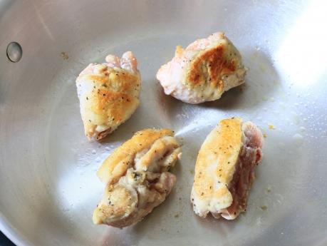 鶏もも肉(骨付き・ぶつ切り、200g)は塩(小さじ1/3)・こしょう(少々)をし、薄力粉(適量)をまぶします。オリーブ油(適量)をひいたフライパンで焼き色をつけ、取り出します。