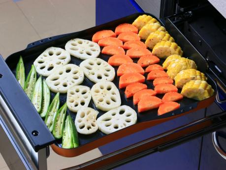 にんじん(80g)は1㎝厚さの半月切り、れんこん(100g)は1㎝厚さの輪切り、とうもろこし(ゆで、1/3本)は半月切り、おくら(4本)は縦半分に切ります。塩・こしょう(各少々)、オリーブ油(適量)をからめて、おくらが手前になるようプレートパンに並べて、マルチグリルを≪調理モード:焼く 火加減:中≫に設定し、8~10分焼きます。