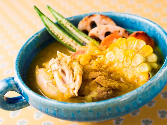 鶏肉を取り出してほぐします。塩・こしょう(各少々)、ガラムマサラ(少々)で味を調えて器に盛り、(3)の焼き野菜とほぐした鶏肉を添えます。