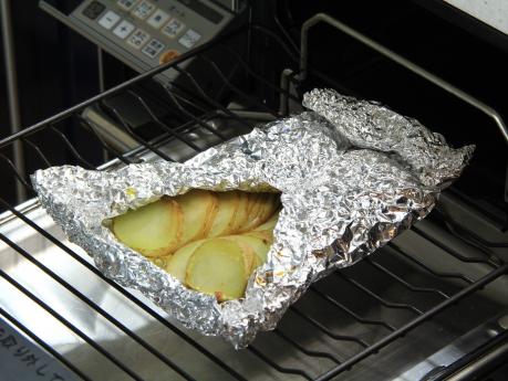 ジャガイモは皮付きのまま2mm厚さにスライスし、水にさらします。アルミ箔に並べて包み、≪グリル≫で焼きます。