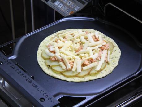 フライパンを≪温度キープ機能200℃≫に設定し、設定温度になれば(3)をおき、蓋をして焼きます。生地を裏返してEVオリーブ油を塗り(1)を並べ、汁気を切ったツナ、ピザ用チーズをのせます。蓋をしてさらに焼きます。