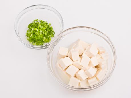 器に冷やしごはん、(1)、鶏そぼろを盛り、(2)をかけて青ネギを散らします。