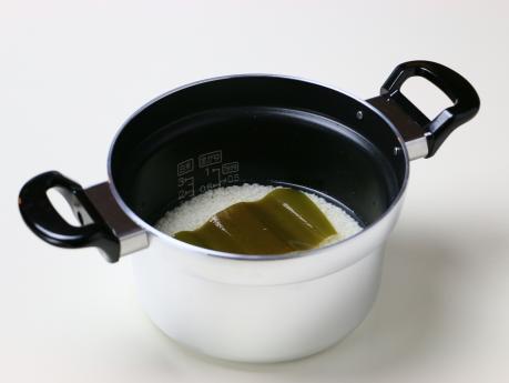 米は洗ってザルに上げ、炊飯専用鍋に入れて分量の水と昆布を入れて30分以上浸します。