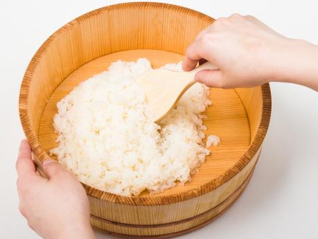 炊き上がれば合わせ酢を加えて寿司飯を作り、4等分して軽く握ります。