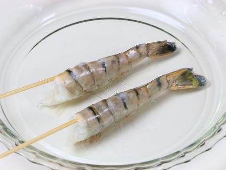 エビは背ワタを取り、まっすぐになるように竹串をさして塩を加えた熱湯で茹でます。