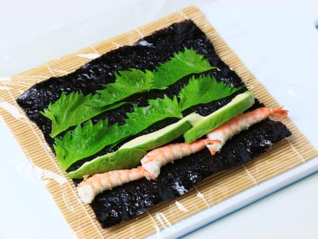 大葉を並べ、手前に3、4をのせ、調味料(a)を塗って巻きます。(4本作ります)