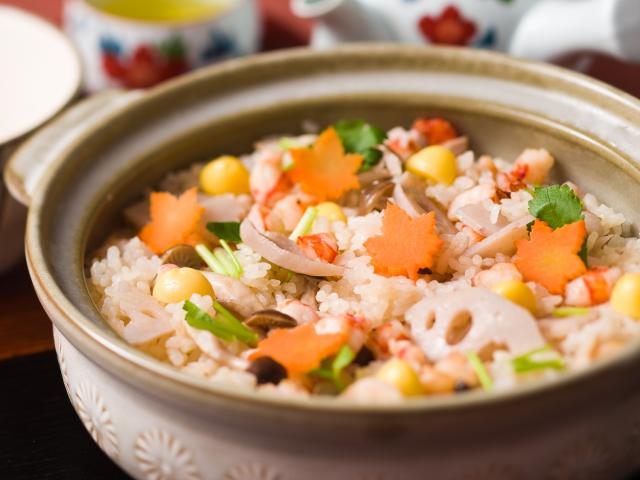 炊き上がれば器に盛り、ニンジン、ギンナン、2cm長さに切った三つ葉を散らします。