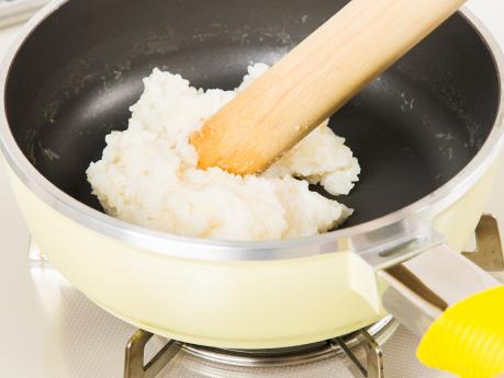 モチ米は洗ってザルに上げ、フライパンに入れて、分量の水に約30分浸します。