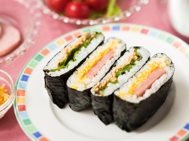 のりの中央に白ごはんを広げ、4等分にした(1)をのせ、白ごはんをかぶせるようにおきます。