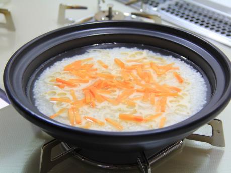 炊く直前に昆布を取り出し、(2)をのせ、炊きます。