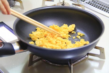 フライパンにサラダ油をなじませ、≪温度キープ 140℃≫に設定します。設定温度になれば、(b)を流し、炒り卵を作ります
