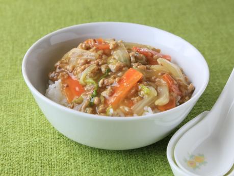 器に(1)を盛り、(2)をのせ糸唐辛子、韓国のりを飾ります。