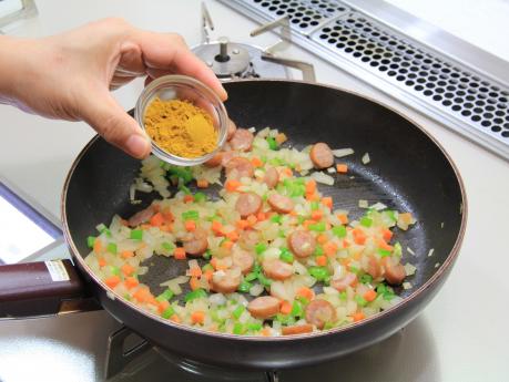 ごはんを加えてカレー粉がなじむように炒め、レーズンを加え、塩、コショウで味を調えます。