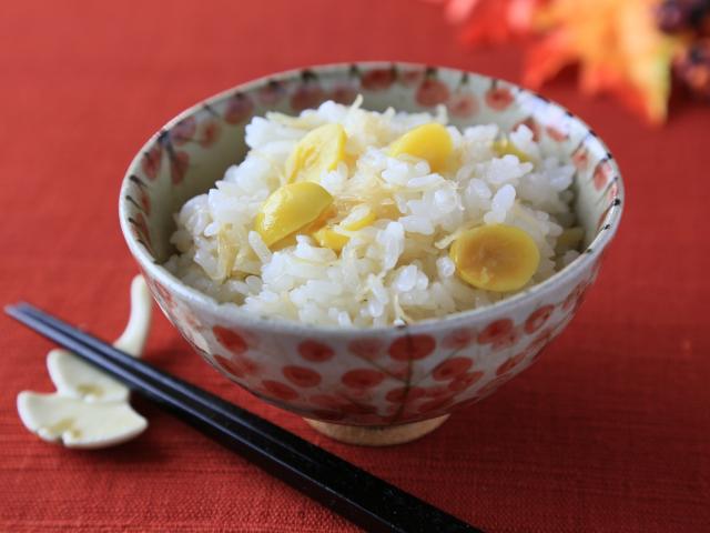 ぎんなんは殻を割って薄皮が付いたまま茹で、水に取って薄皮をむいて半分に切り、炊き上がったごはんに混ぜます。