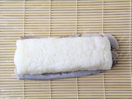 巻きすにラップを敷き、(5)を置き、ユズの皮のせん切りを散らします。(2)を軽くまとめてのせ、サバ全体に広げラップで包むように締めながら巻き、形を整えます。